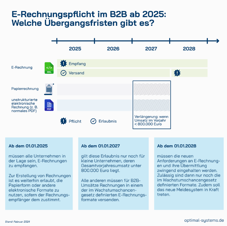 Grundsätzlich sind ab dem 1. Januar 2025 alle Unternehmen verpflichtet, elektronische Rechnungen (E-Rechnungen) zu empfangen und auszustellen. Es gibt jedoch Übergangsfristen für die Erstellung, um dem hohen Umstellungsaufwand gerecht zu werden. Diese sind noch nicht final beschlossen und können sich daher ändern. Aktuell sind folgende Fristen geplant: