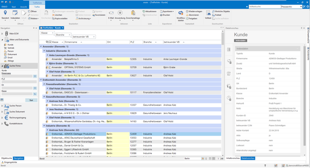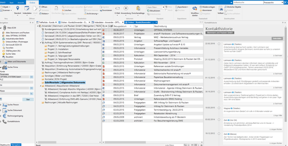 Mit der enaio® Geschäftspartnerakte können Sie Ihre CRM-Kommunikation intern und extern nachhaltig verbessern. Durch die sofortige Informationsverfügbarkeit wird die Auskunftsfähigkeit Ihrer Mitarbeiter im Kontakt mit Kunden, Lieferanten oder Partnern deutlich gesteigert. Das erleichtert Ihr Beziehungsmanagement, steigert die Zufriedenheit und trägt zum gezielten Ausbau Ihrer After-Sales-Dienstleistungen bei.